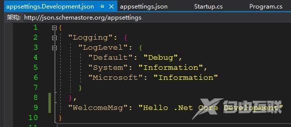 然后F5运行, 可以看到网页上输出Hello .Net Core, 没有问题. 那么接下来我们在appsettings.Development.json里面配置一个相同的配置项, 把值改一下, 如图