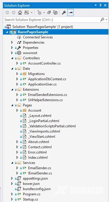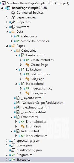 除了两个标准文件 Program.cs 和 Startup.cs ,一切都在Pages文件夹中;请注意,某些页面具有匹配的后台代码文件。