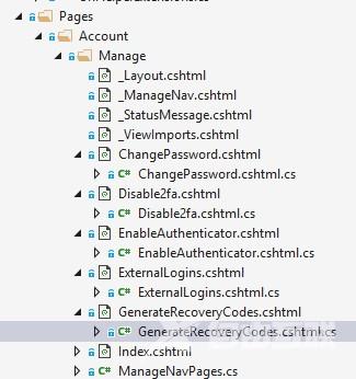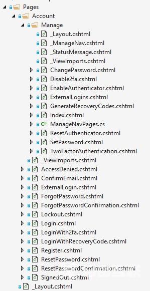 首先注意到是没有Views文件夹, 如果没有选择"授权"选项, 那么也不会有"Controllers"文件夹。在我们的例子中,有AccountController控制器,在 Pages 文件夹中包含Account 文件夹。该文件夹的中,我们存放Razor页面,在MVC中这些代码通常放在 ~Views/Account 文件夹中: