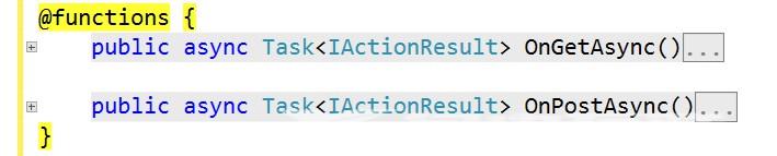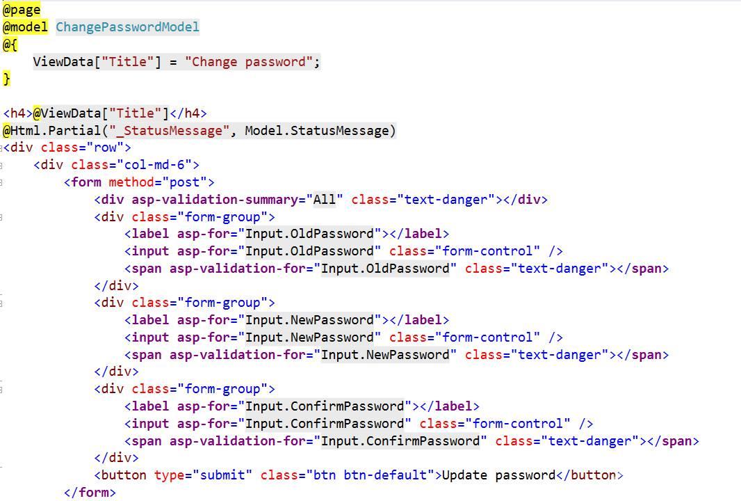 此外,我们可以将所有的页面代码放在 .cshtml 文件中。例如,我们可以将这两个函数从ChangePassword.cshtml.cs文件移动到ChangePassword.cshtml中: