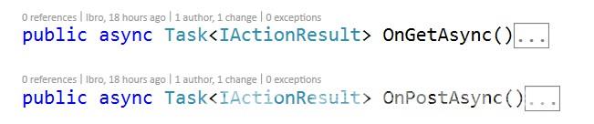 OnGetAsync和OnPostAsync是Razor页面 handlers约定好了的名称。一旦您打开ChangePassword页面,OnGetAsync handler 将执行,当您从ChangePassword.cshtml页面提交表单,OnPostAsync handler 将被触发。