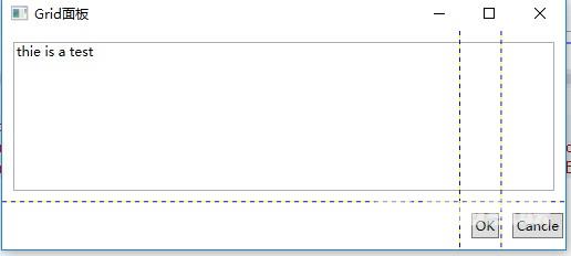 1 <Window x:Class="WpfDemo.MainWindow" 2 xmlns="http://schemas.microsoft.com/winfx/2006/xaml/presentation" 3 xmlns:x="http://schemas.microsoft.com/winfx/2006/xaml" 4 Title="Grid面板" Height="237" Width="525" WindowStartupLocation="CenterScreen"> 5 <!--定义网格,此处显示了网格线--> 6 <Grid ShowGridLines="True"> 7 <Grid.RowDefinitions> 8 <RowDefinition Height="*"></RowDefinition> 9 <RowDefinition Height="Auto"></RowDefinition> 10 </Grid.RowDefinitions> 11 <Grid.ColumnDefinitions> 12 <ColumnDefinition Width="*"></ColumnDefinition> 13 <ColumnDefinition Width="Auto"></ColumnDefinition> 14 <ColumnDefinition Width="Auto"></ColumnDefinition> 15 </Grid.ColumnDefinitions> 16 <TextBox Margin="10" Grid.Row="0" Grid.Column="0" Grid.ColumnSpan="3">thie is a test</TextBox> 17 <Button Margin="10,10,2,10" Padding="3" Grid.Row="1" Grid.Column="1">OK</Button> 18 <Button Margin="10,10,2,10" Padding="3" Grid.Row="1" Grid.Column="2">Cancle</Button> 19 </Grid> 20 </Window>