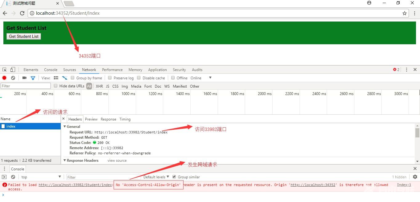 其中,WebApi项目的端口号是:33982,MVC项目的端口号是:34352(这两个端口号是在本机的地址,在其他电脑上端口号可能不同)。显而易见:两个项目的端口号不同,不属于同源,如果在MVC里面通过前端调用WebApi提供的数据接口,就会出现跨域的问题。