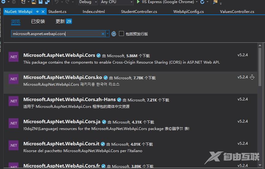 在WebApi项目上右键->管理NuGet程序包,然后搜索“microsoft.aspnet.webapi.cors”,选择第一个进行安装