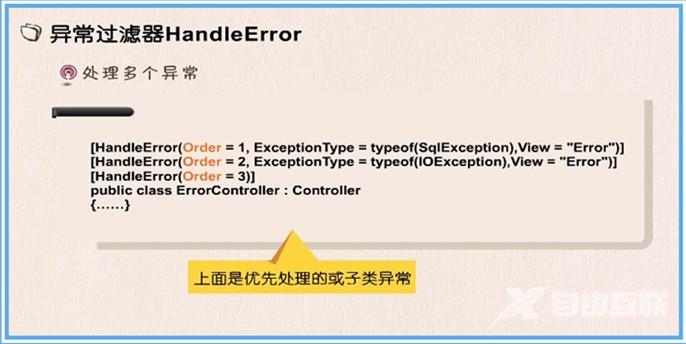 在同一个控制器或Action方法上可以通过HandleError处理多个异常,通过Order属性决定捕获的先后顺序,但最上面的异常必须是下面异常的同类级别或子类。如下图所示:
