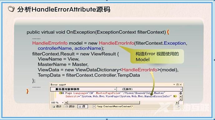 查看MVC源码,可以发现HandleError返回的是HandleErrorInfo类型的model,利用该model可以获取异常的具体信息,修改Error视图页面如下: