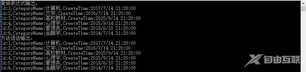 Console.WriteLine($"Id:{item.Id},CategoryName:{item.CategoryName},CreateTime:{item.CreateTime}");