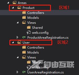 上图中有两个模块:一个是User模块,另一个是Product模块,所有关于这两个模块的Controller、Model、View都放入各自的模块内。而且从上图中可以看出:区域的功能就类似于一个小的MVC项目,虽然项目小,但是有自己的控制器、模型、视图和路由设置。