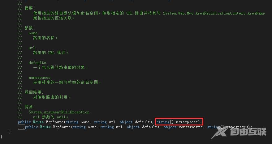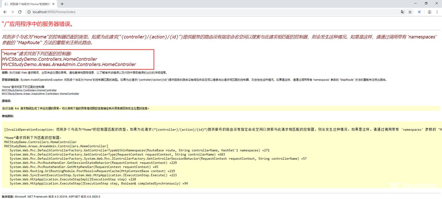 从上面的截图中可以看出这时候在访问就出错了,因为程序中存在两个HomeController,程序不知道要访问哪个控制器,所以根据错误提示需要在区域路由里面添加namespace,区分一下两个HomeController,区域路由中查看MapRoute的定义: