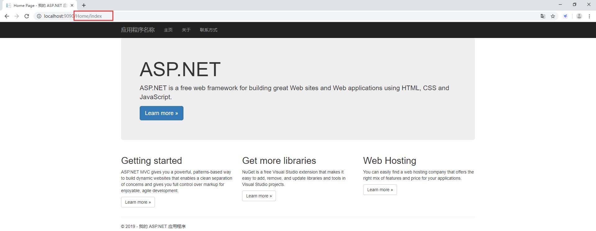 这时在访问一下新建MVC项目时自带的HomeController控制器的Index页面,浏览器运行效果如下: