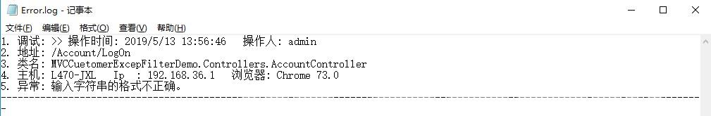 本案例要实现的功能需求:在发生异常时记录日志,日志内容包括发生异常的Controller名称、Action名称、使用浏览器类型和版本等。