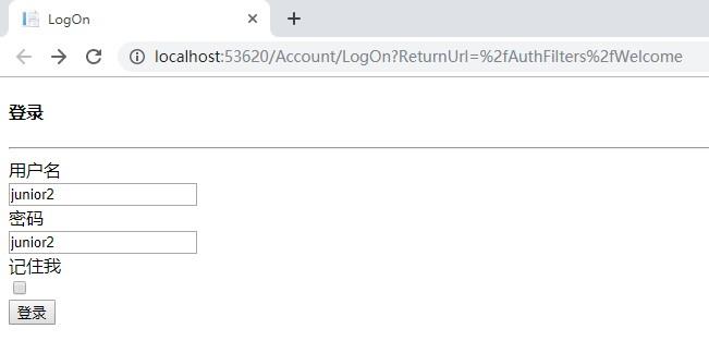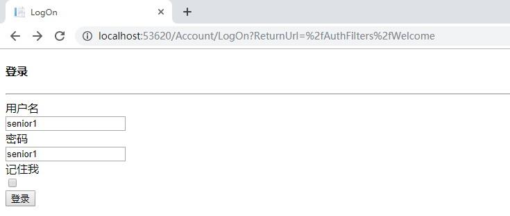 URL地址栏里面输入:http://localhost:****/AuthFilters/Welcome,会跳转到登录页面,如图所示: