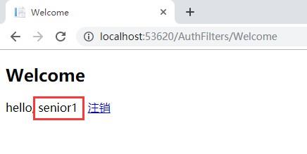 Welcome这个Action使用了默认的授权验证,只要登陆成功就可以访问。其他几个Action上都标注了自定义的UserAuthorize,并没有标注Users="....",Roles=".....",因为这样在Action上写死用户或者角色控制权限显然是不可行的,用户和角色的对应以及不同的角色可以操作的Action应该是从数据库里取出来的。为了演示就在SampleData类里初始化了一些用户和角色信息,根据SampleData类的定义,很明显jxl拥有1号管理员角色,可以访问AuthFilters这个控制器下的所有Action;senior1、senior2拥有2号高级会员的角色,可以访问AuthFilters这个控制器下除了AdminUser之外的Action等等。再次登陆下,就发现拥有高级会员角色的用户senior1是不可以访问AdminUser这个Action,会被带到AuthorizationFailView属性指定的Error视图。