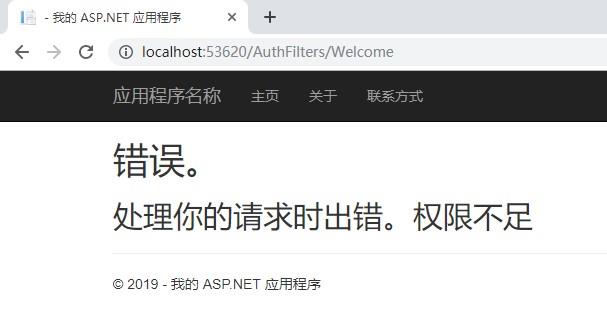 由于junior2的角色是3,而角色3没有访问Welcome方法的权限,所以会跳转到Error页面: