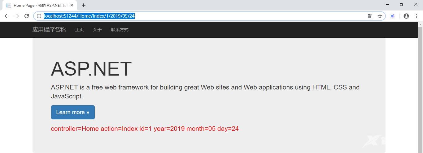 运行程序,在浏览器里面输入:http://localhost:51244/Home/Index/1/2019/05/24,效果如下:
