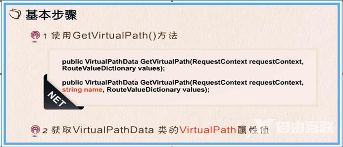 由路由生成URL其实就是简单的两句代码,第一步就是使用RouteCollection对象的GetVirtualPath方法,通过该方法可以返回一个VirtualPahData对象,该类型表示有关路由和虚拟路径的信息,包含了两个重载的方法,区别是第二个方法可以指定路由项的名称,就是添加路由时,设置的路由键名,参数Values表达生成URL时设置的参数值,是一个字典类型。