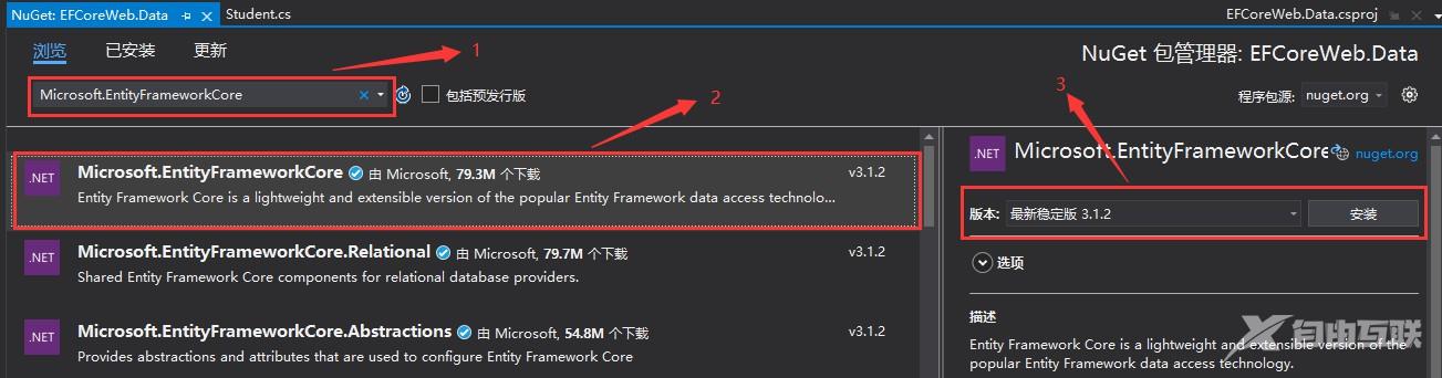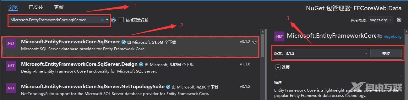 然后在EFCoreWeb.Data类库项目里面添加Mircosoft.EntityFrameworkCore包,直接在NuGet里面安装: