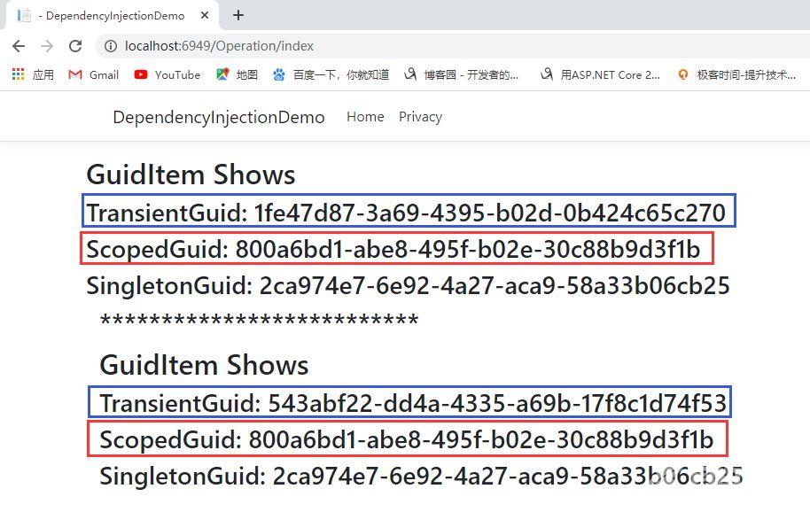 然后我们打开两个浏览器,刷新多次,只会发现“TransientGuid” 和“ScopedGuid”的值在不断变化,而“SingletonGuid”的值是不会变化的,这就体现了单例模式的作用,如下图所示: