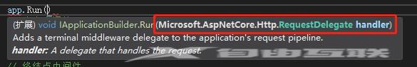 中定义中可以看出:Run()方法中只有一个RequestDelegate委托类型的参数,没有Next参数,所以Run()方法也叫终端中间件,不会将请求传递给下一个中间件,也就是发生了“短路”。看下面的代码: