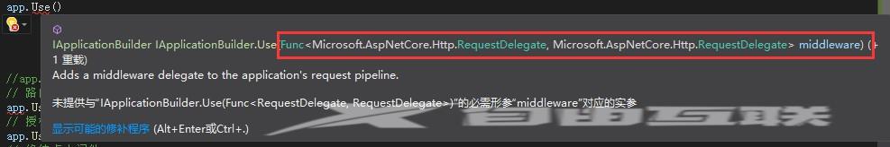 // 向应用程序的请求管道中添加一个Func委托,这个委托其实就是所谓的中间件。
