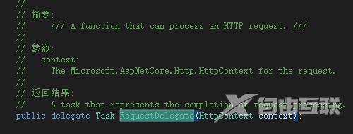 可以看出:Use方法的参数是一个Func委托,输入参数是一个RequestDelegate类型的委托,返回参数也是一个RequestDelegate类型的委托,这里表示调用下一个中间件,我们在来看看RequestDelegate委托的定义: