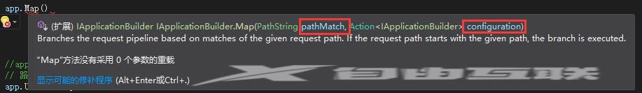 可以看到Map方法有两个参数:第一个参数是匹配规则,第二个参数是Action泛型委托,泛型委托参数是IApplicationBuilder类型,和Configure方法的第一个参数类型相同。这就表示可以把实现了Action泛型委托的方法添加到中间件管道中执行。
