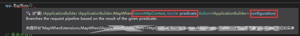 可以看出:MapWhen方法有两个参数:第一个参数是Func类型的委托,输入参数是HttpContext,输出参数是bool类型。第二个参数是Action委托,参数是IApplicationBuilder类型,表示也可以把实现Action委托的方法添加到中间件管道中执行。