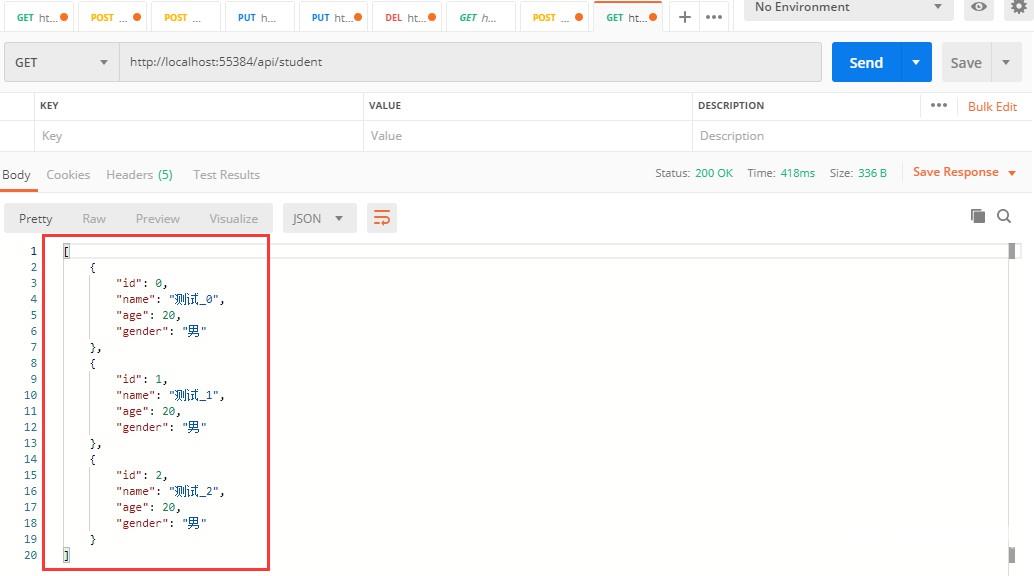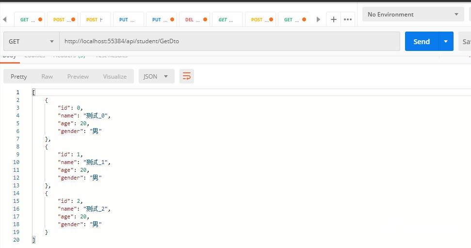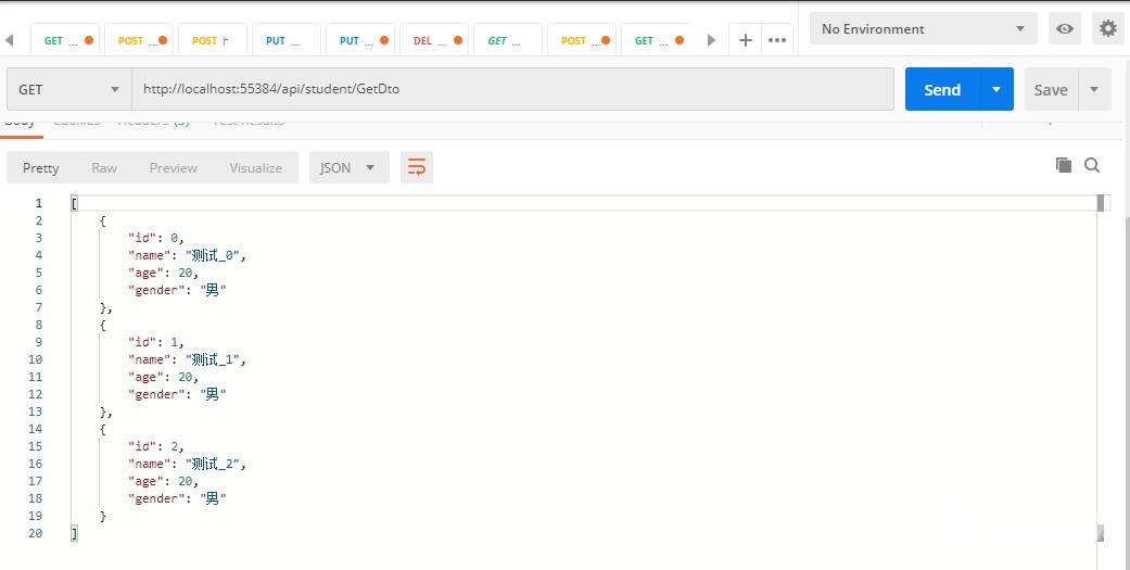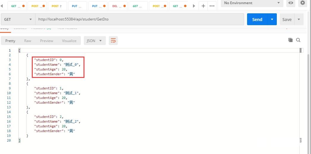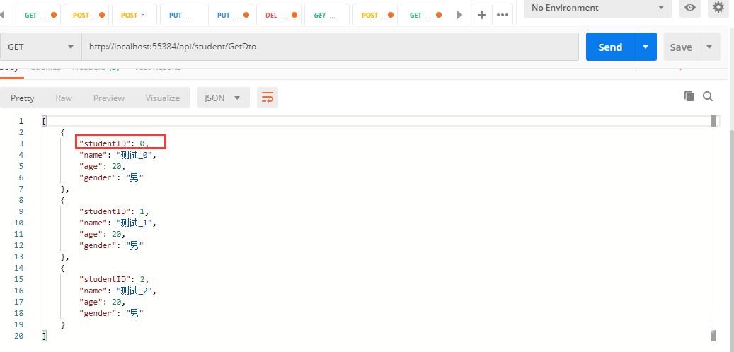 可以看到:这时返回的是DTO类型的数据。这种情况就是我们上面说的,需要手动修改代码,然后循环给对应的属性进行赋值。这里Student类只有4个属性,如果属性非常多,或者很多地方使用到了,如果还是采用这种方式进行赋值,那么就会很麻烦。假如以后其中的一个属性名称改变了,那么所有的地方也都需要修改,工作量就会很大。这时就需要使用AutoMapper解决。