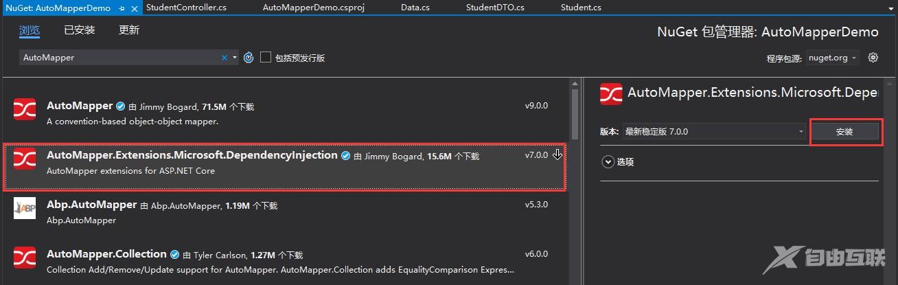 这里选择安装AutoMapper.Extensions.Microsoft.DependencyInjection这个包。这个包主要是为了让我们可以通过依赖注入的方式去使用AutoMapper。