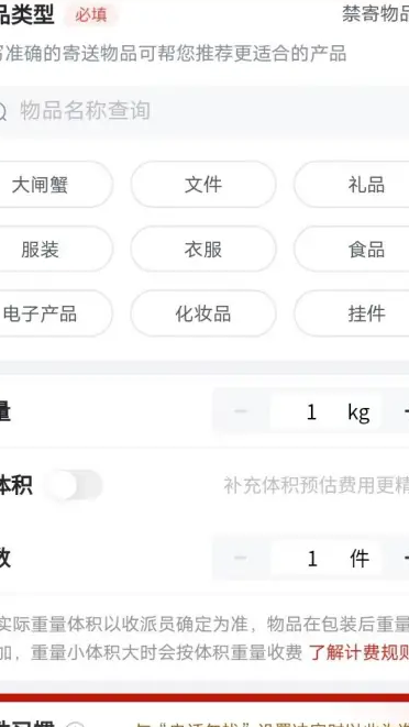 2、在寄快递页面依据实际情况准确选择货物的相关信息,做好寄件准备。