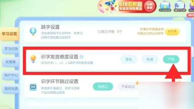 3、在学习设置界面对应位置,选择识字发音难度选项,完成难度调整操作。