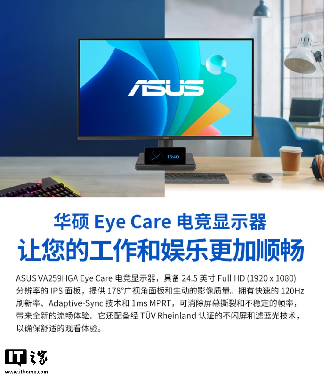 11 月 26 日消息,华硕现已推出 VA259HGA 显示器,主打办公等场景,内置 24.5 英寸 1080P(注:1920*1080) IPS 面板,支持壁挂安装,售价 610 元。