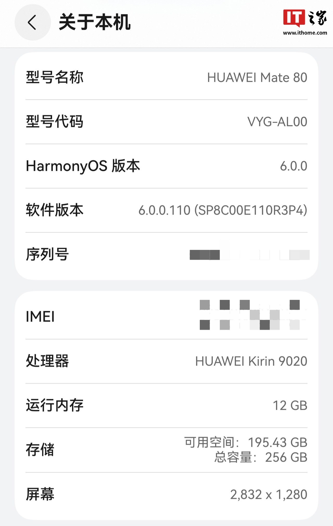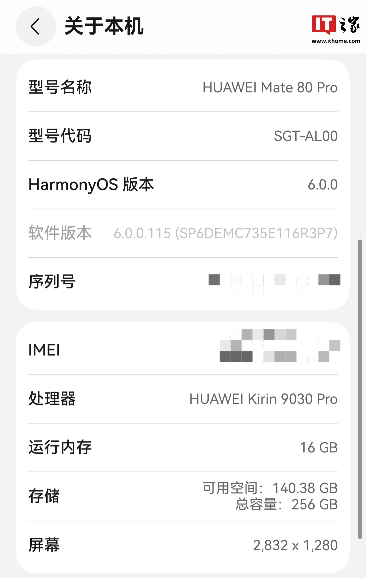 实测发现,除了在官网显示外,华为 Mate 80 系列手机还支持在设置页面查看处理器型号,这也是华为 Mate 正代旗舰系列相隔两代(Mate 60 / Mate 70)后,全系机型首次可见 HUAWEI Kirin 芯片。