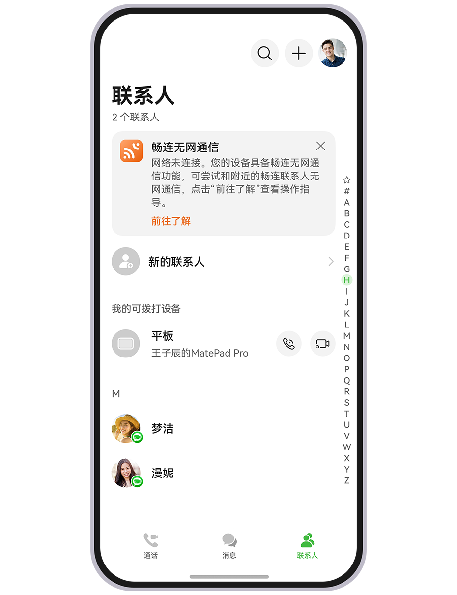 需要注意的是,无网消息和无网通话功能要求发送和接收方互为畅连联系人。此功能可在双方设备任意一方无网或双方均无网,且在星闪可感知范围内使用。