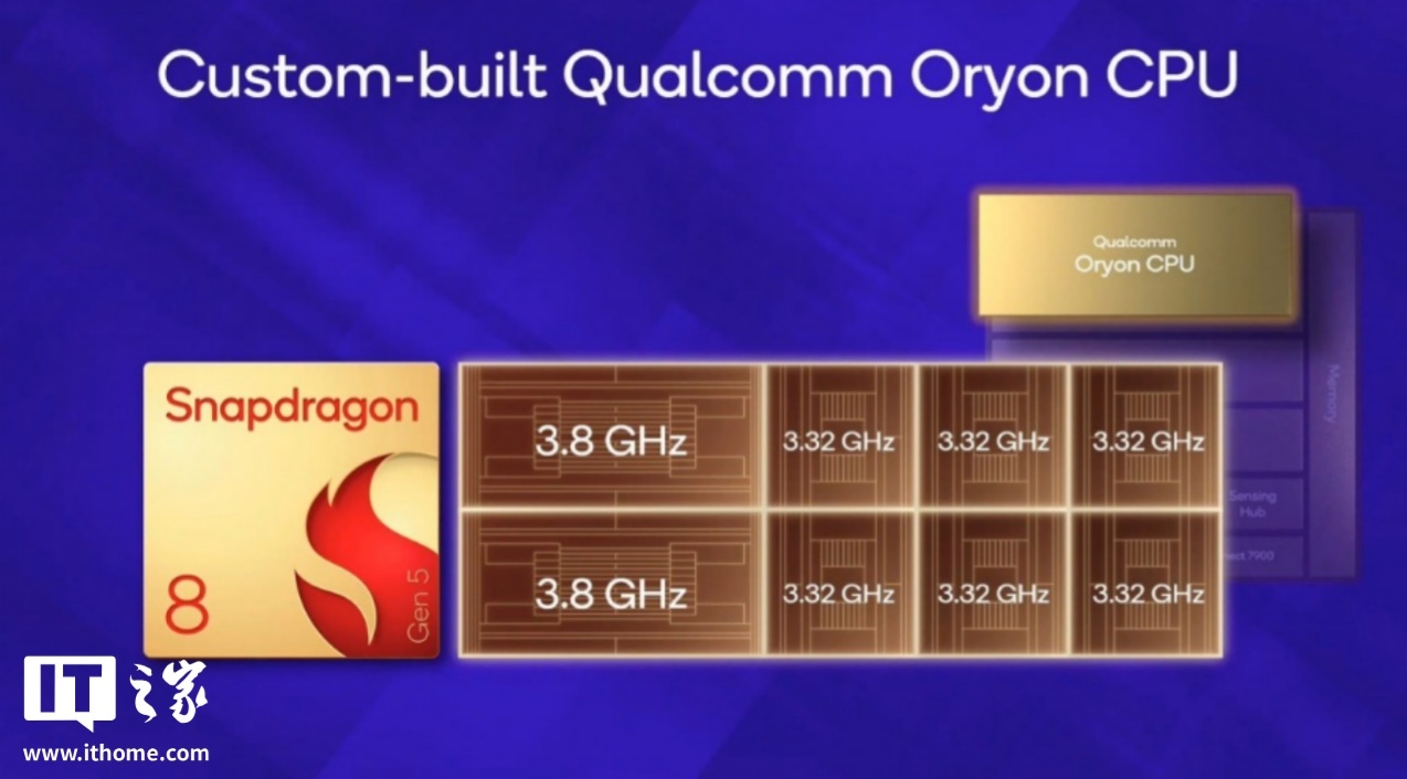 结合今天报道,高通骁龙 8 Gen 5 处理器现已正式发布,配备第三代 Oryon CPU,包括 2 个主频为 3.8 GHz 的 prime 核心和 6 个 3.32GHz 的性能核心,相比两年前的骁龙 8 Gen 3 在 CPU 任务上有 36% 提升,GPU 提升 11%,AI 任务提升 46%。
