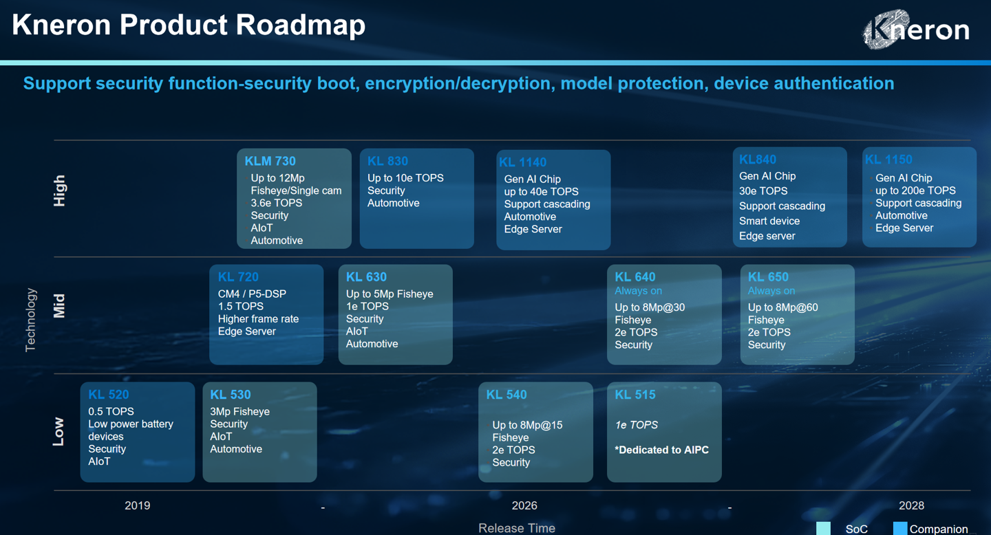 Kneron 还公布了未来三年的芯片产品蓝图,计划 2028 年推出 200e TOPS 算力的 KL1150。