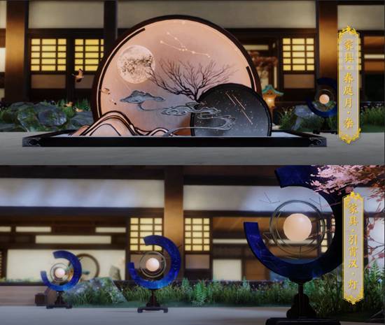家具“春庭月·杂”以友人的痴情为题,月光将树影映照在墙面,一轮明月情意绵绵,为其洒下一片清光,照耀着满庭的落花,意境优美。能驻光阴,解留颜鬓,引君霄汉。云锦楼的小师傅将星空的颜色凝练熔铸,做成环形星汉,中部以荧惑石为月灯,模拟星月引航的景色,命名为“引霄汉·灯”。