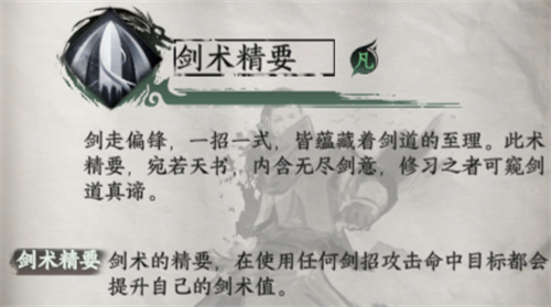剑术的精要,在使用任何剑招攻击命中目标都会提升自己的剑术值。
