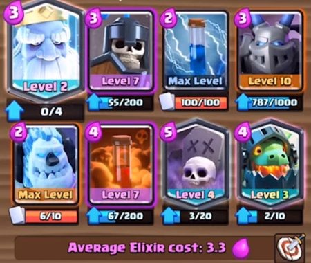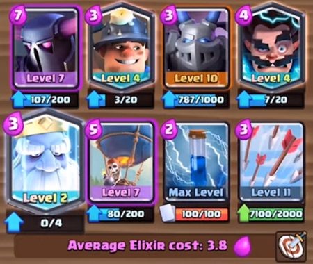 先给你一套大皮卡和御鬼的套牌。虽然目前不是很常见,但还是一个强大的组合。大卡牌可以先用来防御,因为圣水消耗比较高,最重要的是可以用来化解对手硬逼的肉盾单位。在开始时,鬼和矿工可以用来骚扰对手和探索他们的甲板。气球兵可以配合矿工消耗,也可以配合大型皮卡防守反击,玩法相当灵活的卡组。