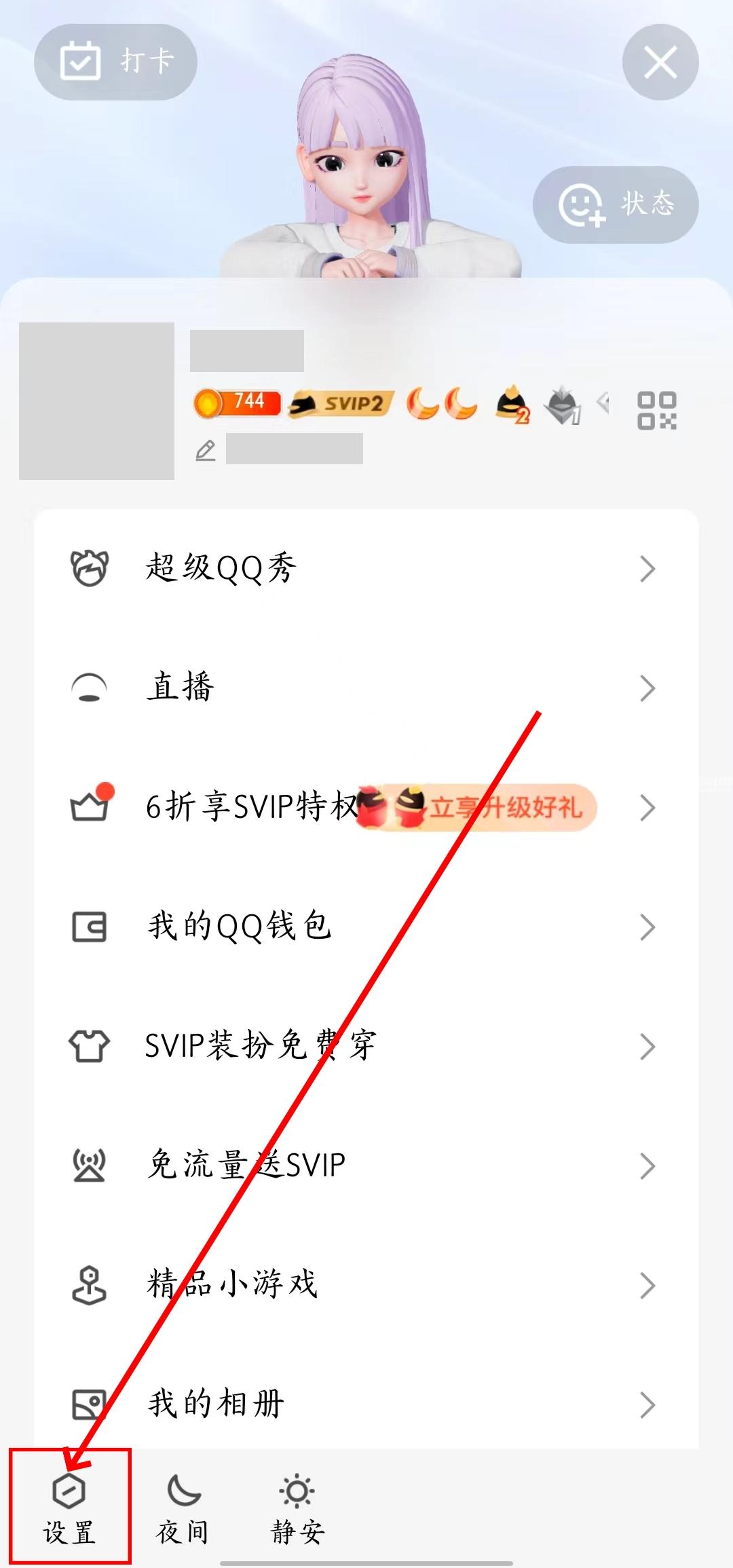 2、点击左上角自己的头像,找到左下角设置。