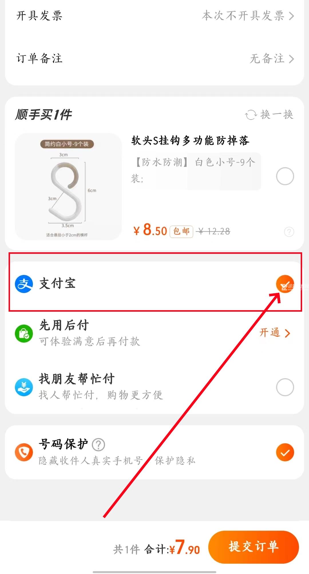 1、在付款支付页面选择支付宝。