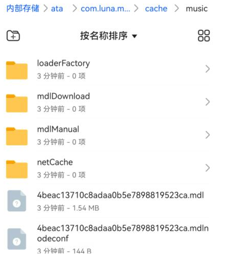答:位置在【文件管理】—【com.luna.music】—【cache】—【music】