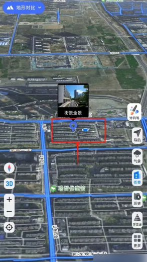 2、在街景查看模式下拖动位置坐标,将其放置在想要查看的具体位置,点击街景全景图标进行定位确认。