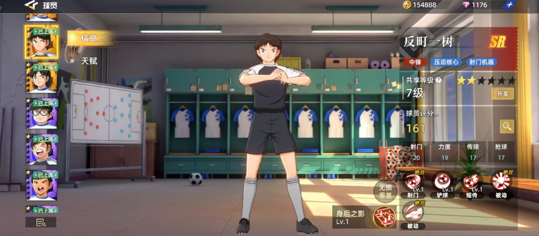 反町一树是SR品质当中的一位中锋球员,目前用反町一树来压迫核心的话也是效果不错的,而且也被大家称作是射门机器,所以代表后期这个球员在射门动作当中也是有相应技能可以使用,在现在的总体球员评分当中反町一树达到161的得分,这个得分相比一般情况下SR球员只有120左右的评分来说,高出了很多,所以才说作为中锋的话反町一树是有很大潜力的,那么在当前的六维图当中他比较出色的几项数值有射门达到20分,所以说他的射门动作后期用到的情况有很多,而另外还有力度19、传球17、抢球17的得分都是会为他射门带来足够基础支持的。