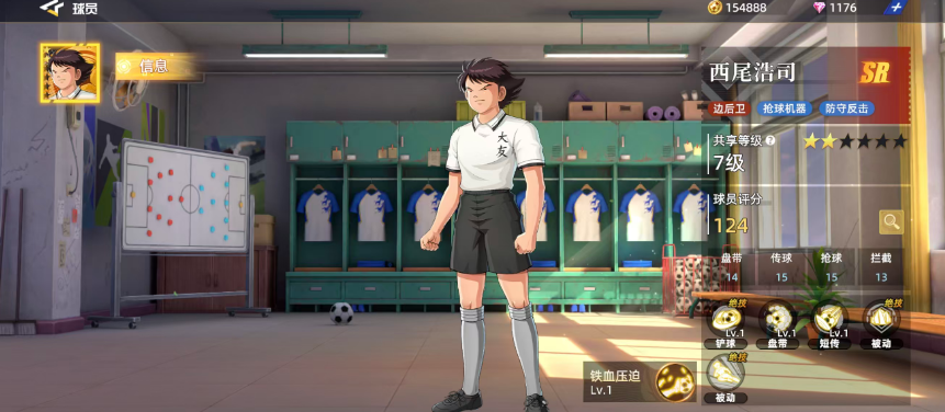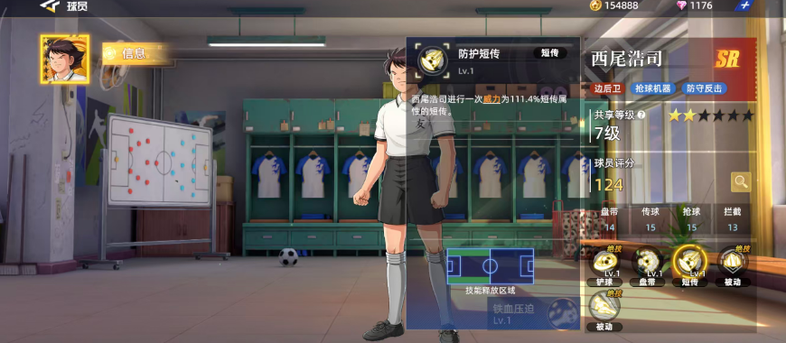 游戏当中西尾浩司作为一个SR品质的角色,前期还是有一定机会可以获取的,他在游戏当中如果放在球队里面一般是作为边后卫使用的,他的抢球机制可以为他带来来足够的能力,所以后期大家使用他的话,防守反击也是可以利用起来的,这个球员目前的总体评分达到了124,在SR品质角色里面,这个分值还是非常不错的,在其中比较强势的几个的属性就是盘带、传球、抢球以及拦截,其中的传球跟抢球的比分都是15分,然而盘带的话则是14分的得分,在拦截的属性上是只有13的评分。