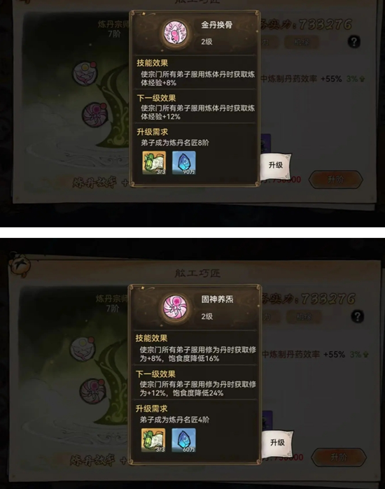 在《最强祖师》中,要以最少丹药达成金仙境界与炼体圆满,关键在于提升丹药利用率。准备工作包括:任命该弟子为掌门(提升15%修为效率)、入住满级洞府(增加30%修炼效率)、关闭本命法宝蕴养(避免修为转化灵性)、佩戴对应资质/根骨+3玉符,并利用呦呦庶务等级进一步提升效率,从而最大化单颗丹药收益。