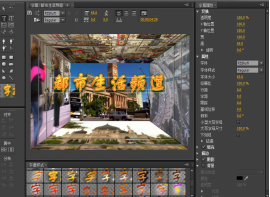 15、单击菜单栏的字幕—新建字幕—默认静态字幕,在弹出的对话框中书写“都市生活频道”六个字。选择它的字幕样式,在右边的字幕属性栏中设置它的字体大小为65,纵横比为100%,如图15所示。将其命名为“都市生活频道”。