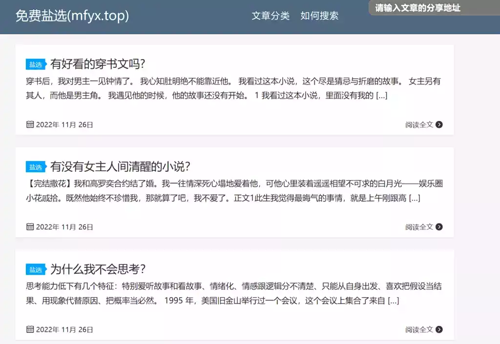前有《我不是药神》《我不是盘神》,如今又出现了我不是盐神!这个平台主要分享一些知乎盐选会员文章,如果你在某乎上看到精彩内容却无法阅读全文,可以尝试复制标题或第一句话到该网站搜索,往往会有意想不到的收获。