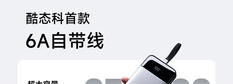 酷态科 25 号超级电能块 SE 自带线充电宝采用 25000mAh 电芯,最高输出功率可达 120W,3C 认证可上飞机。