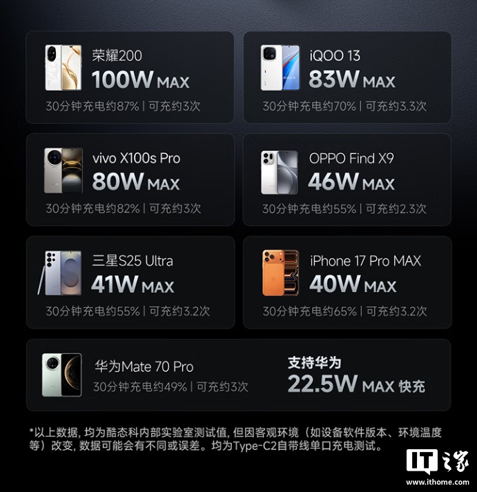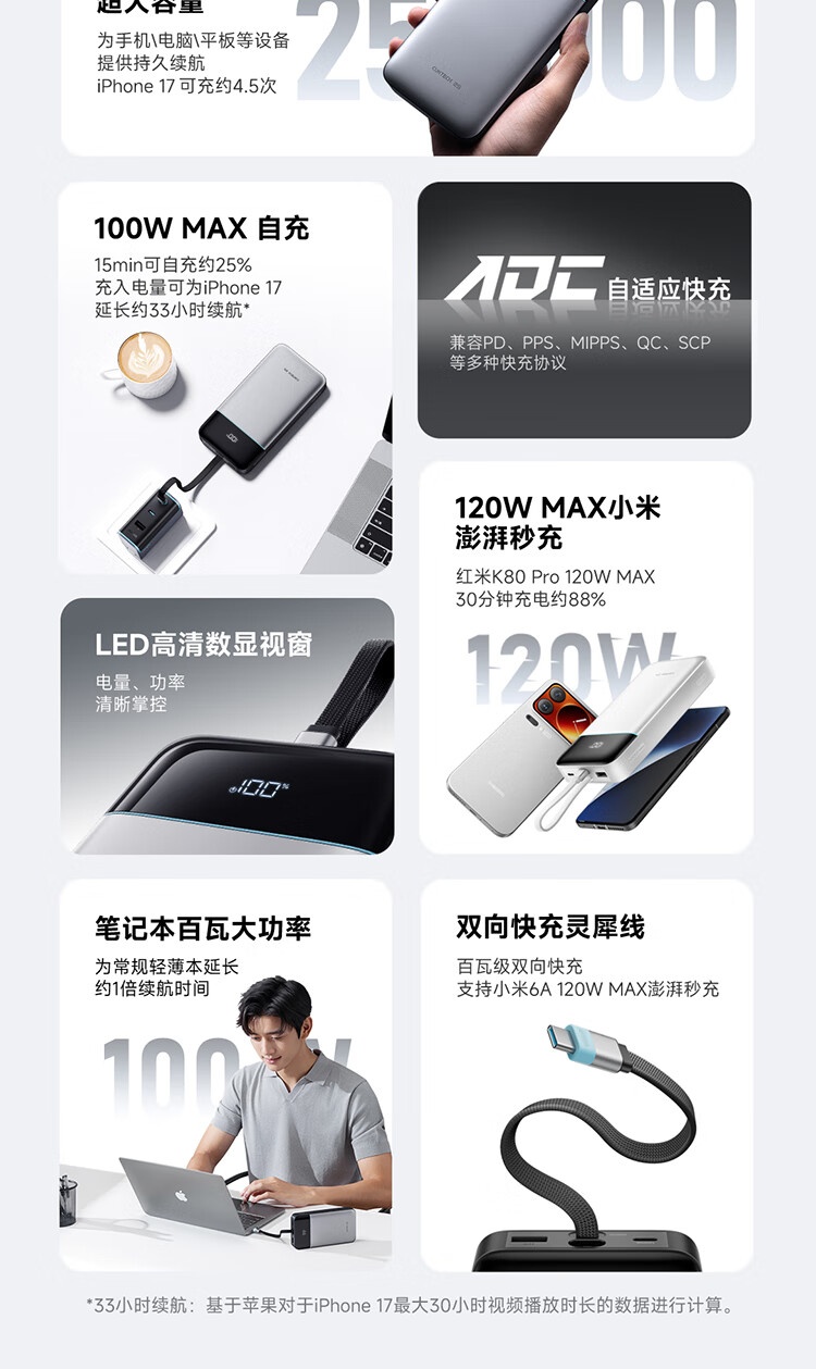 这款充电宝支持 ADC 自适应快充,兼容 PD、PPS、QC、MIPPS、华为 SCP 22.5W 等多种快充协议,可为苹果 iPhone 17 手机充电 4.5 次,自带一根 6A 充电线,自带线及 Type-C 接口均可兼容 120W MAX 小米澎湃秒充。
